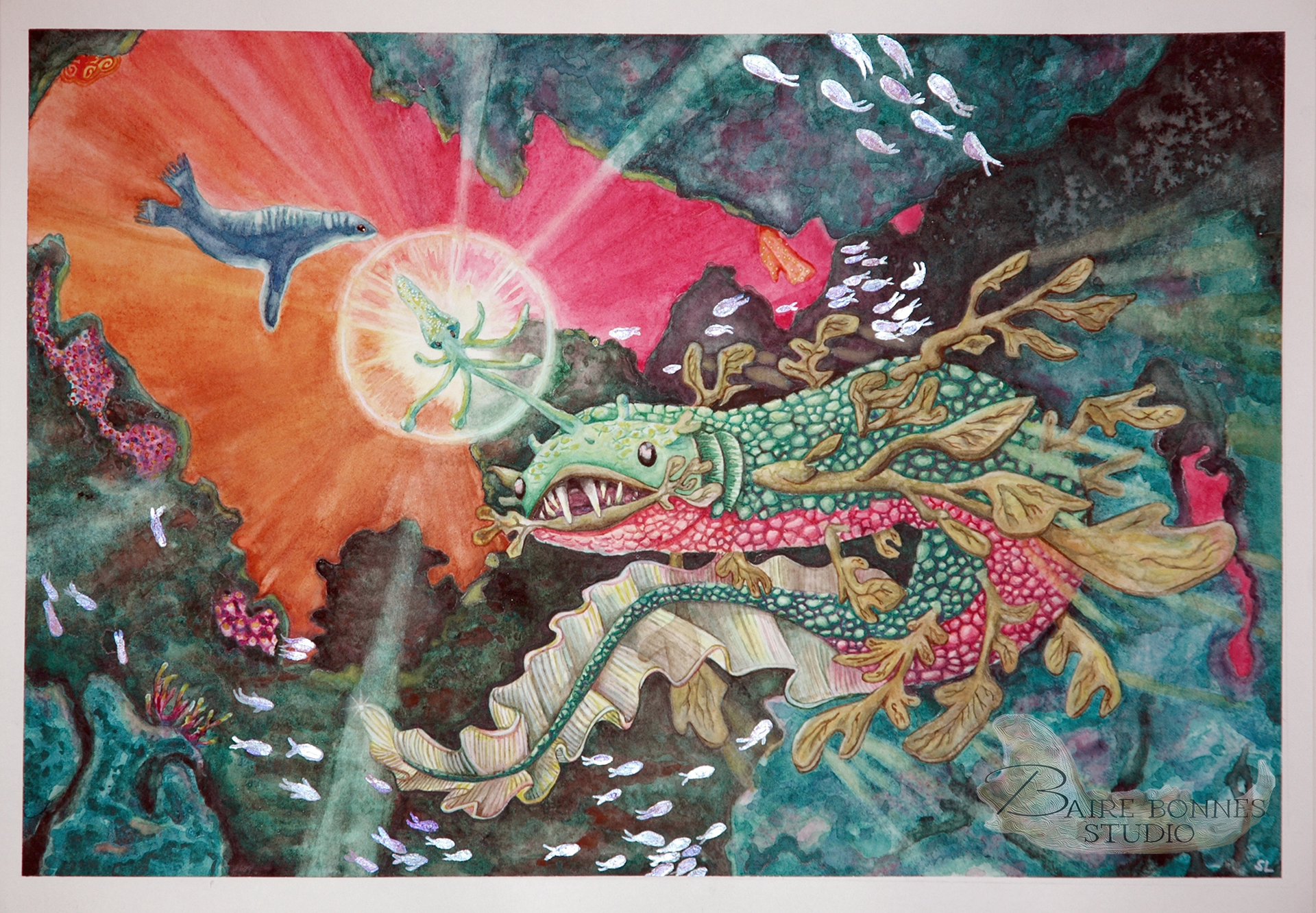 14x20 Watercolor with metallic acrylic highlights on cotton paper, available